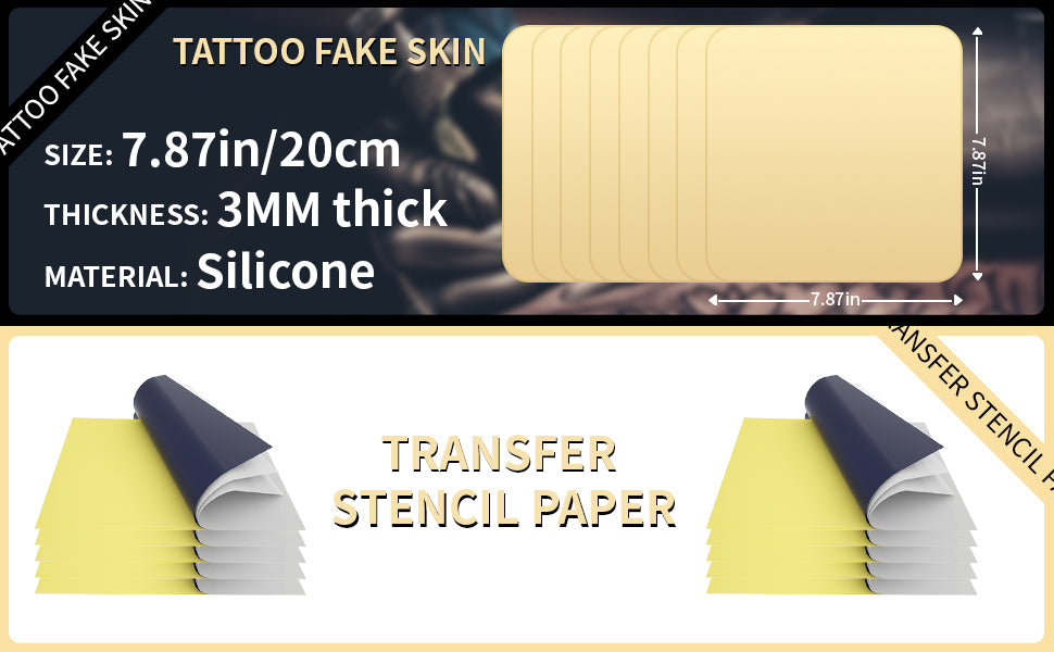 · 【Best Combination】This tattoo practice skin kit includes 8 Pcs 3mm tattoo practice skins as well as 10 Pcs tattoo transfer stencil paper. The size of each practice skin is 7.87*7.87in, and the size of each tattoo template is XX. Both sides of each tattoo fake skin are blank, providing enough space for your masterpiece creation.