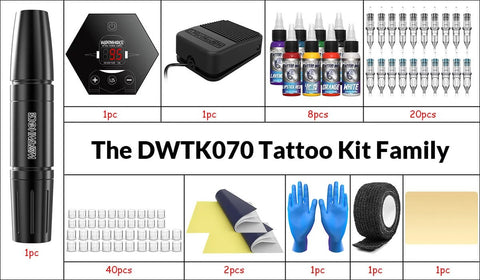 DWTK070 tattoo kit comes with 10pcs liner needle cartridges and 10pcs shader needle cartridges. Tattoo needles marked with “RL” are used for doing lines, marked with “RM” are used for shading and color fill. Needle size can be found on the package. For practicing on fake skin, it can be reused. Each needle single packed.