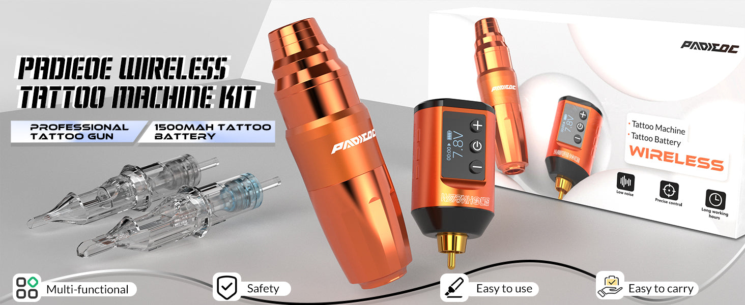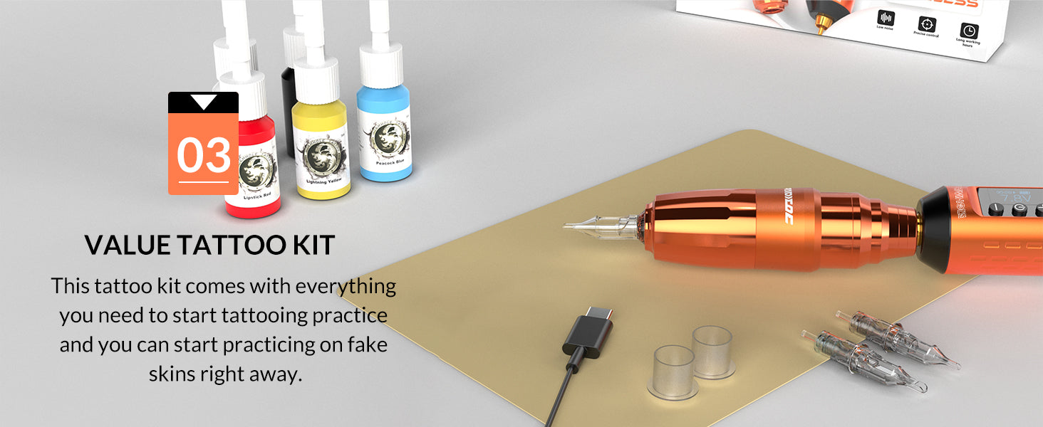 · 【Complete Tattoo Kit】 The Wireless Tattoo Machine Kit includes a 1pc tattoo gun with an RCA cord, 1pc 1500mAh capacity tattoo battery pack, 10pcs tattoo cartridges needles, 2pc tattoo bandage, 5pcs 5ml tattoo ink, 40pcs tattoo ink cups with base, 2pc tattoo transfer paper, 1pc blank tattoo practice skin, 1pc Type-C cable, 1 pair of blue nitrile gloves. This tattoo kit has everything you need for tattooing and the tattoo gun is easy to use and clean.